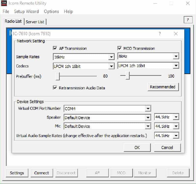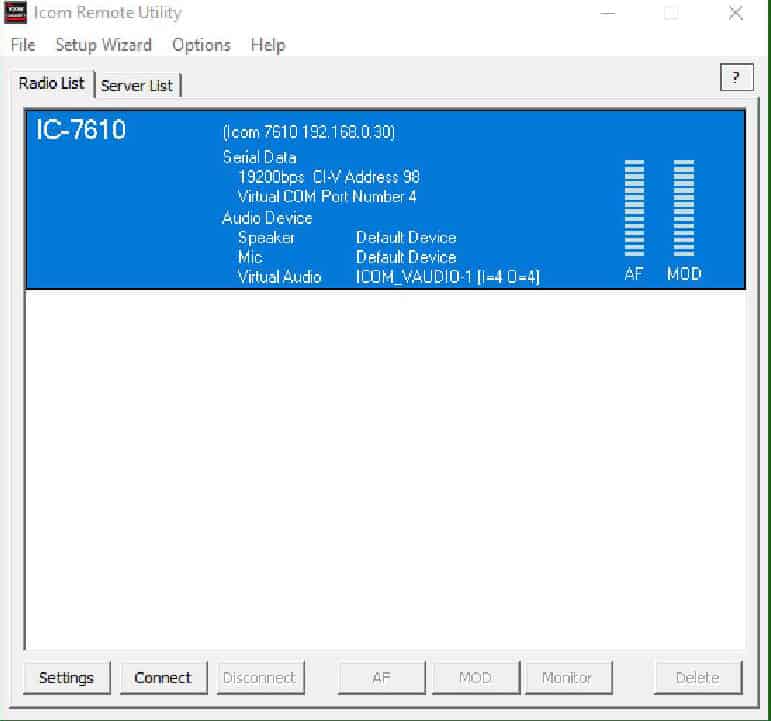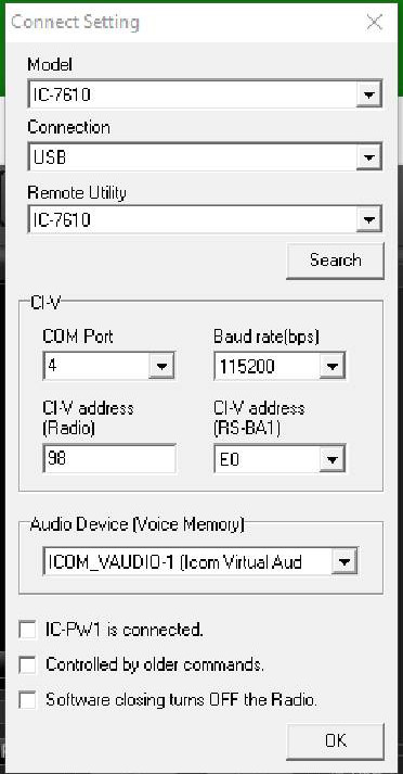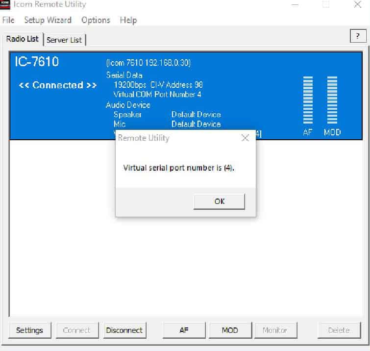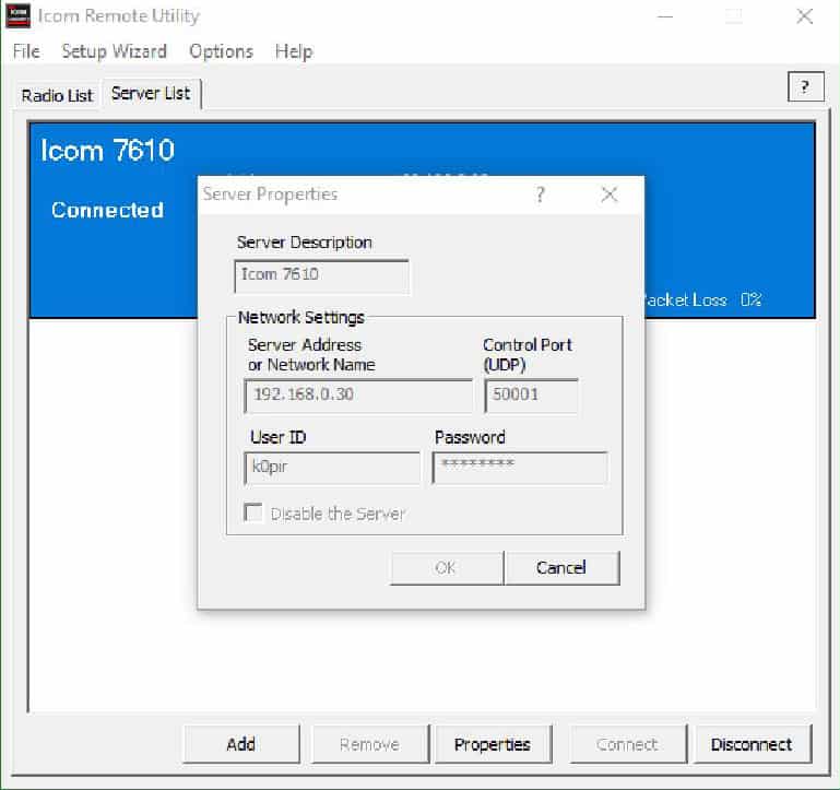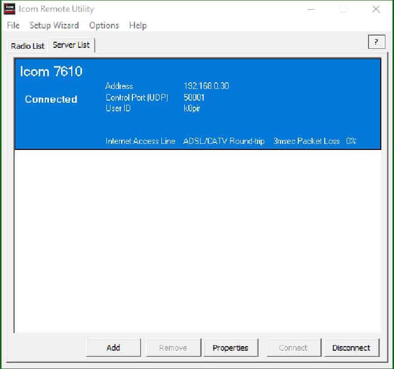Open the Utility and click on the “Add” button to setup and connect to the sever. The Icom 7610 has an internal server. The COM port you select is a virtual port, so the # is not important. I have tried a few and they all worked.
